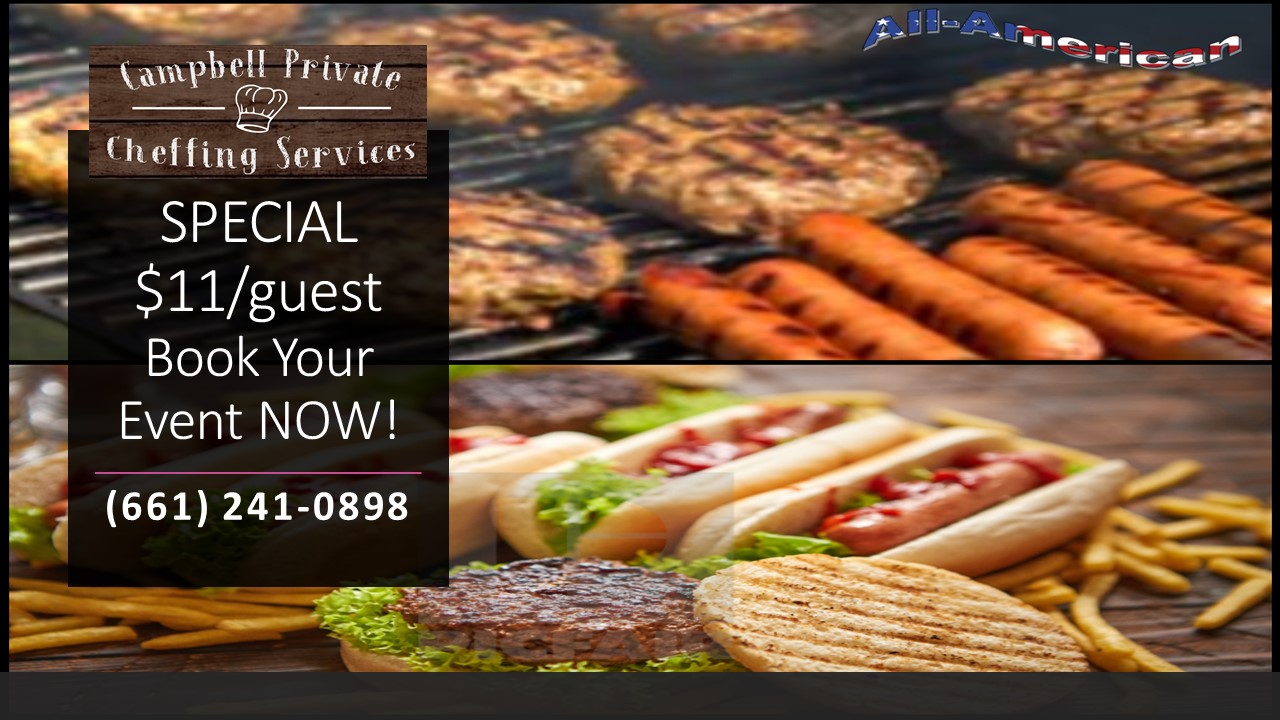 Choice of 2 per Guest; Freshly Grilled or BBQ'd All-Beef Hamburgers with House Seasoning or Hot Dogs